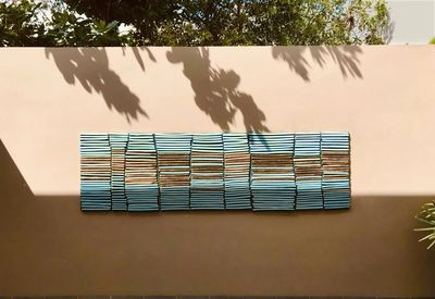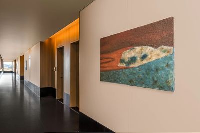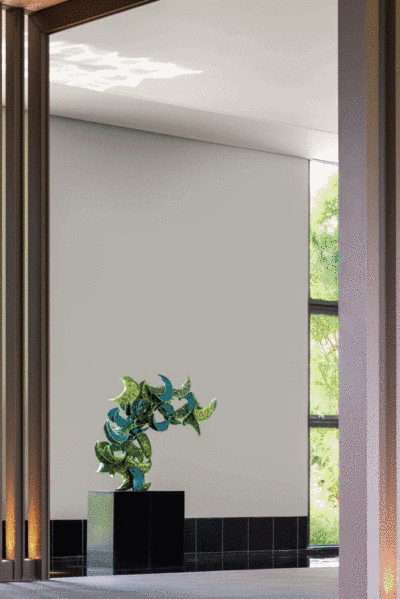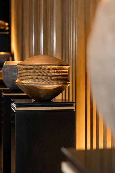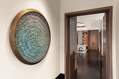 ,使用编织排列形态,染色技术赋予艺术品的湛蓝与碧绿色彩幻化为更原生的质朴艺术,与空间调性达成最高默契的融合。