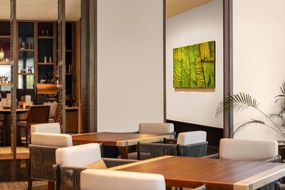 是人与自然对这片土地千百年来的共同雕琢,将这片土地做出真实的呈现纪录,会是对自然与人文的最高致敬。环保材料与稻草本色编织的技艺,以墙面艺术的形态实现了梯田的错落,与金色的稻浪,含着对这方水土的传达给每一位在米市(Rice Market)对大自然的尊敬与惜福的用餐旅人。