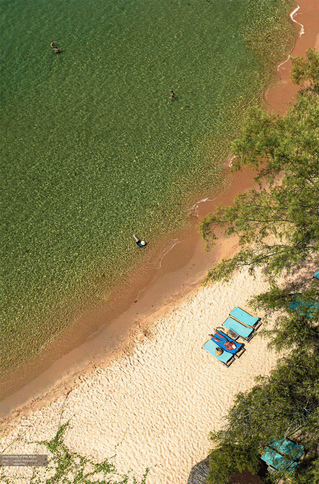 将富国岛独有的薄荷蓝色海水、柔软白色沙滩,与自然植被定格于画框里。以类比富国岛轮廓的画板将不同变幻的