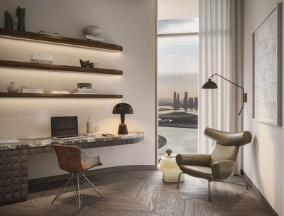 书房设计致力于创造一个宁静、舒适且功能齐全的空间,大理石桌面搭配同造型的木质搁板,营造出简洁而有质感的氛围。旁边的落地窗将自然光引入,也展现了壮丽的外部景观。