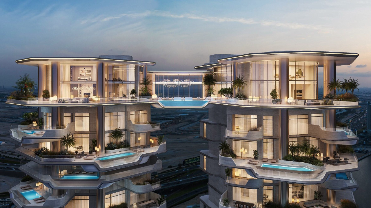 该项目是位于迪拜商业湾区的马拉西码头的两座 180 米高的住宅大楼,其中顶层的泳池不仅是设计的亮点,还形成了两座大楼之间的独特连接。