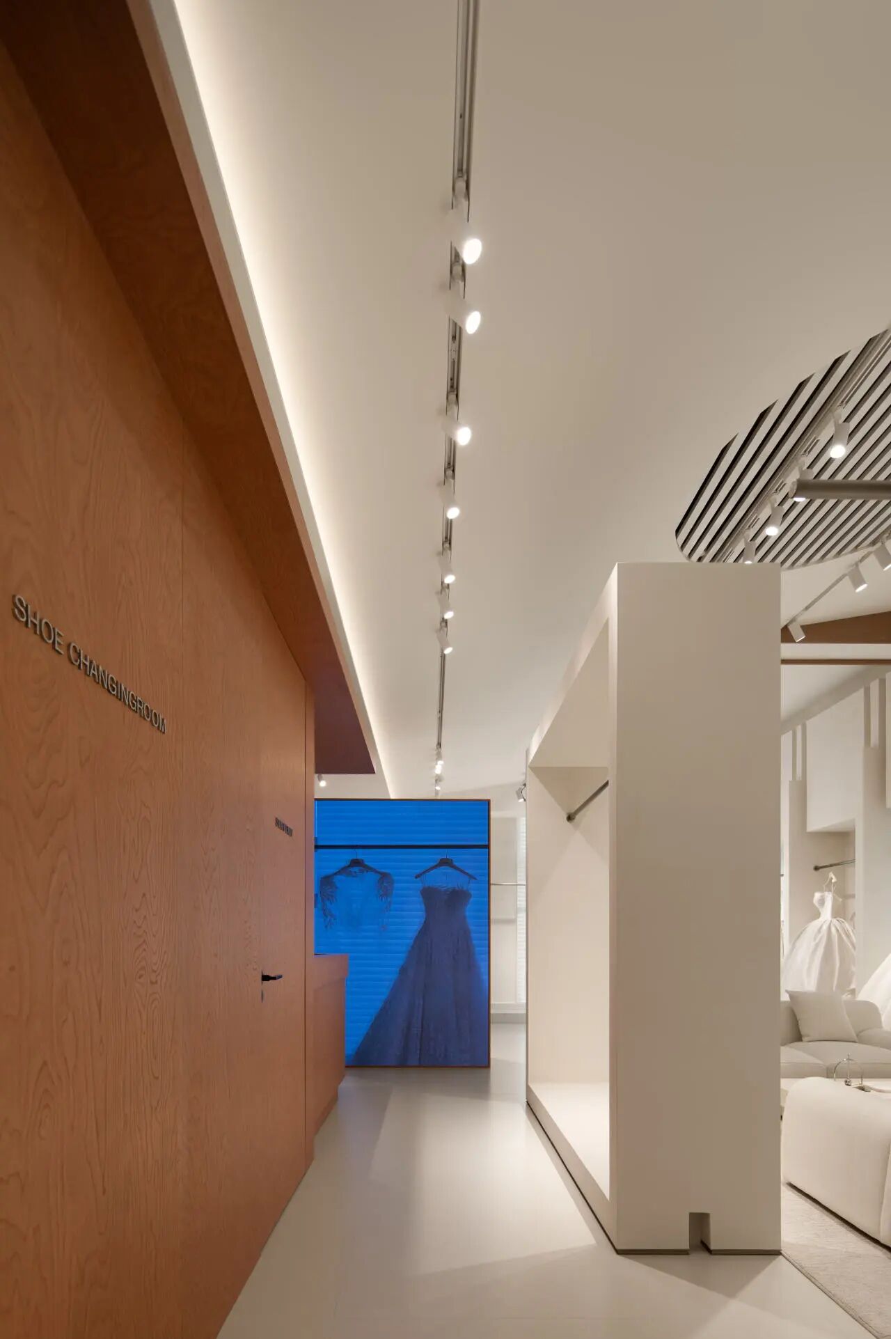 Trying on wedding gowns is the beginning of experiencing happiness. We hope that customers can sense the atmosphere of this space the moment they step in. With warm hues and exquisite fabrics, we enhance the warmth and inclusiveness of the space, showcasing the romance of wedding gowns and pushing the boundaries of spatial aesthetics, while interpreting the inherent sense of value and ritual in a wedding gown gallery.
