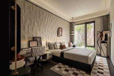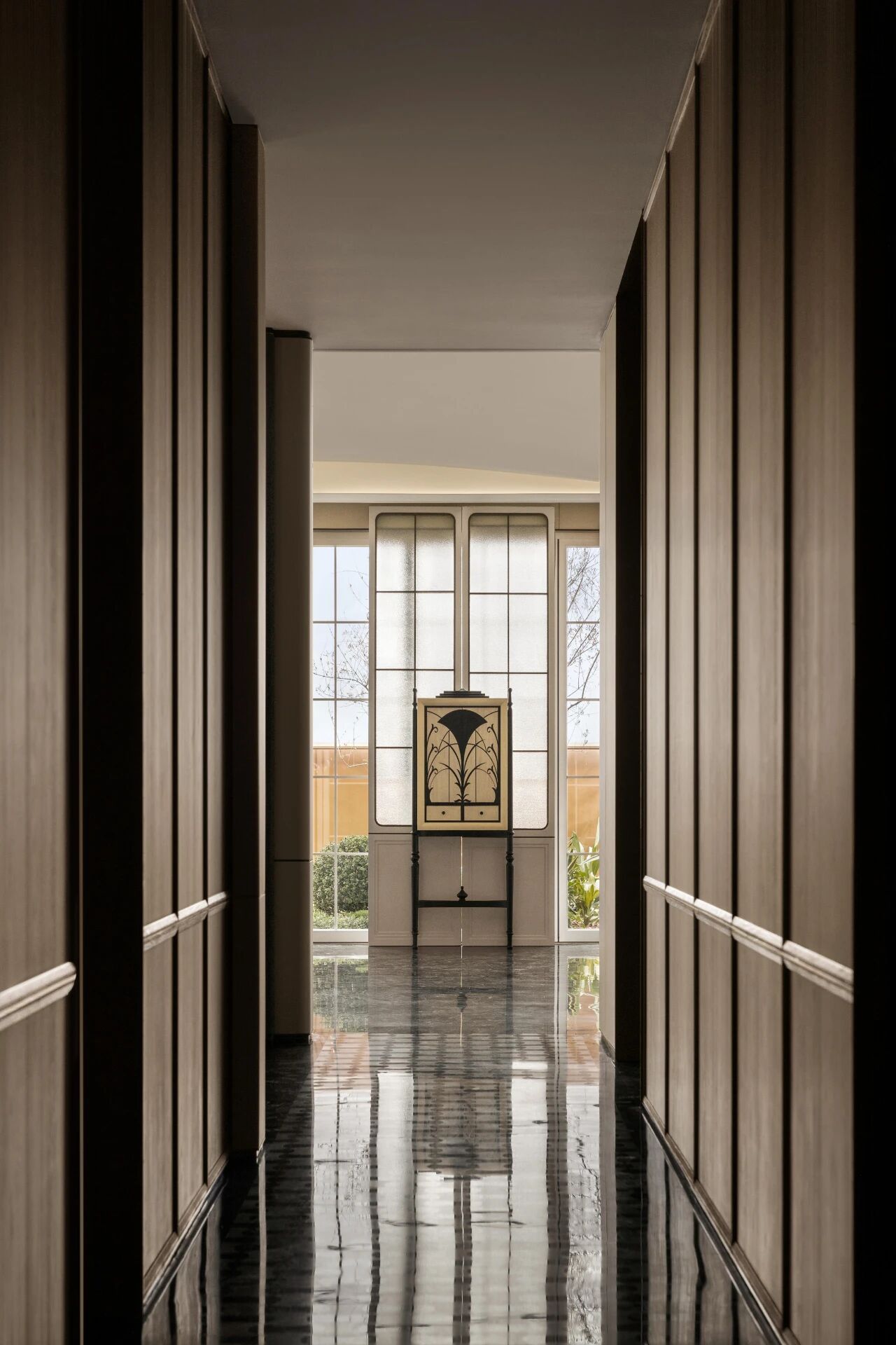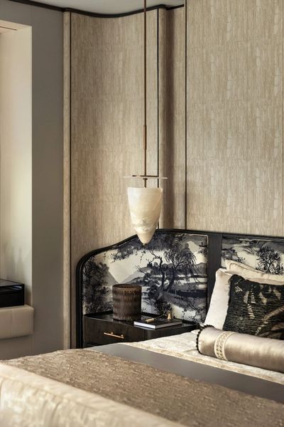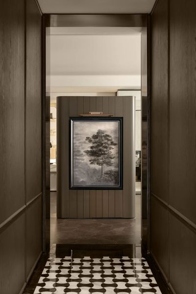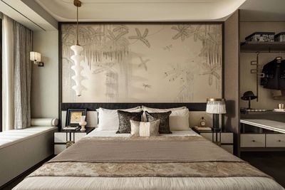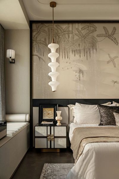 走廊尽头处的艺术画,是步入私密空间的优雅序章。空间巧妙融合了现代舒适与典雅风格,以水墨画环绕床头,更是增添了艺术气息与东方韵味,在简约中透出雅致的文化底蕴。