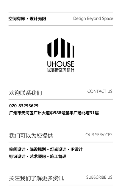 UHOUSE DESIGN(优豪斯空间设计,简称“UHOUSE”)创立于中国广州,践行“以人为本”的设计理念,以其资深的设计团队、丰富的设计经验、严谨的管理制度,为客户量身定制一体化设计服务,提供兼具人文关怀与艺术美学的空间解决方案,强调城市、空间与人的复合共生。