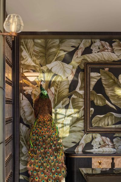 身后伫立着栩栩如生的孔雀雕塑,与热带植物画一起生动演绎异域风情的热烈氛围