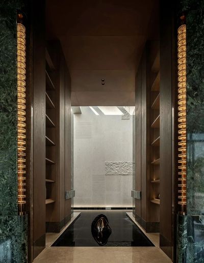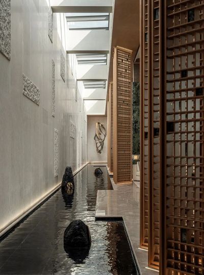 空间边缘设置了水景装置,使自然元素在建筑内部得以延续。天窗引入的自然光让水面泛起微光,形成一处可感知的静谧意象,强化人与自然之间的微妙平衡。