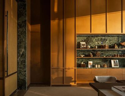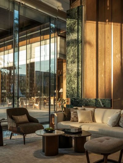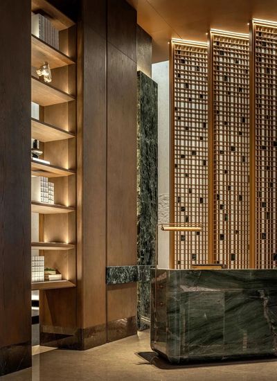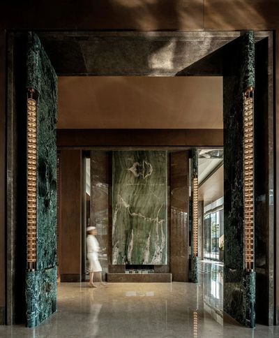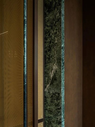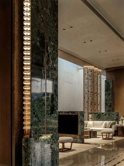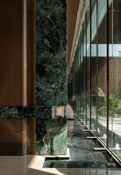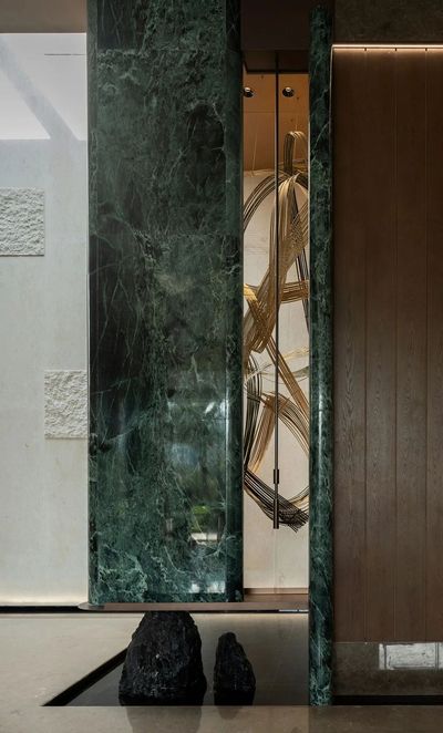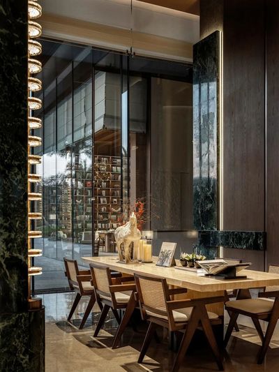 墨绿色大理石与原木材质形成质感对话。深邃与温润两种特质通过材质衔接自然过渡,木材的天然纹理与石材的灵动肌理构成错落有致的视觉效果。大面积落地窗将自然光与室外景致完整引入,虚实相生间营造出丰富的空间体验。