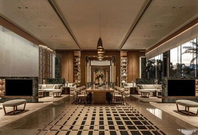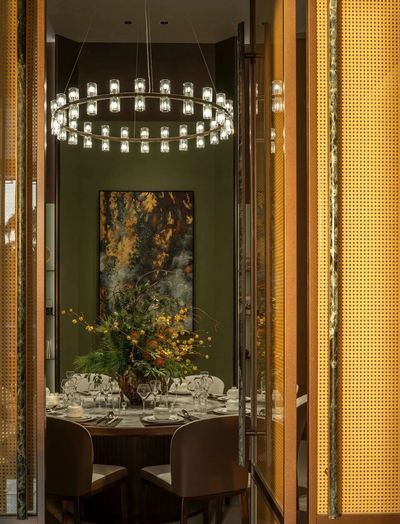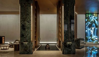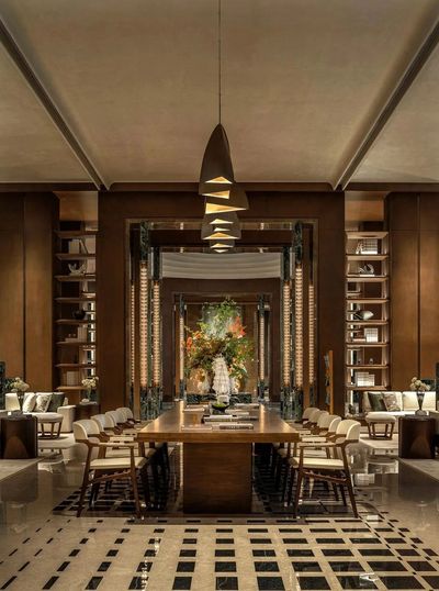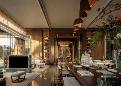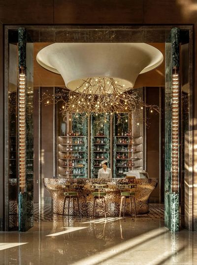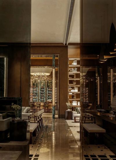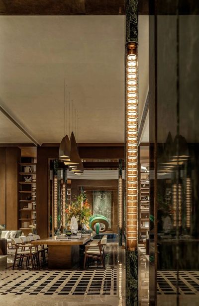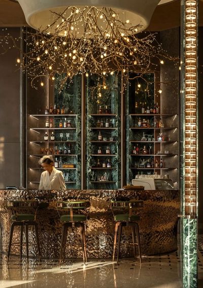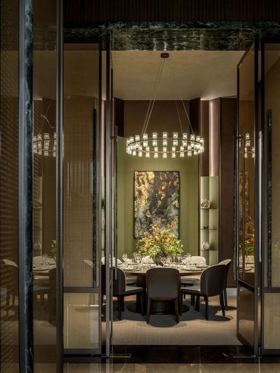 洽谈区后方延伸出一个酒吧空间,吊灯以“枝叶”的造型设计成为视觉焦点。温润的灯光顺势铺陈,仿佛能感受到时间的律动,材质与光影共同营造出生机与灵动感。