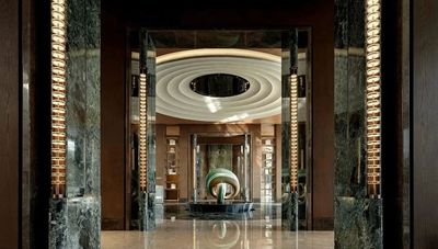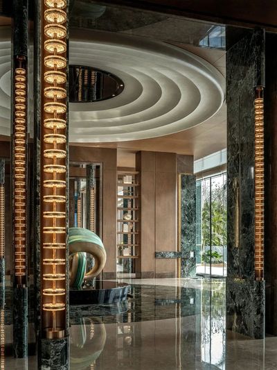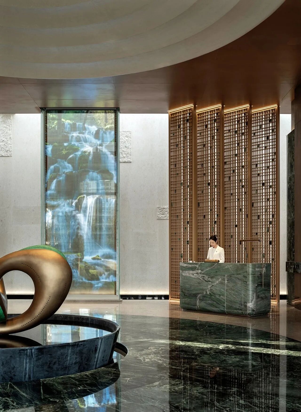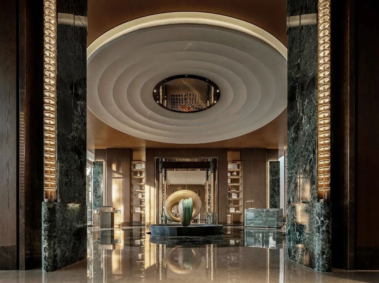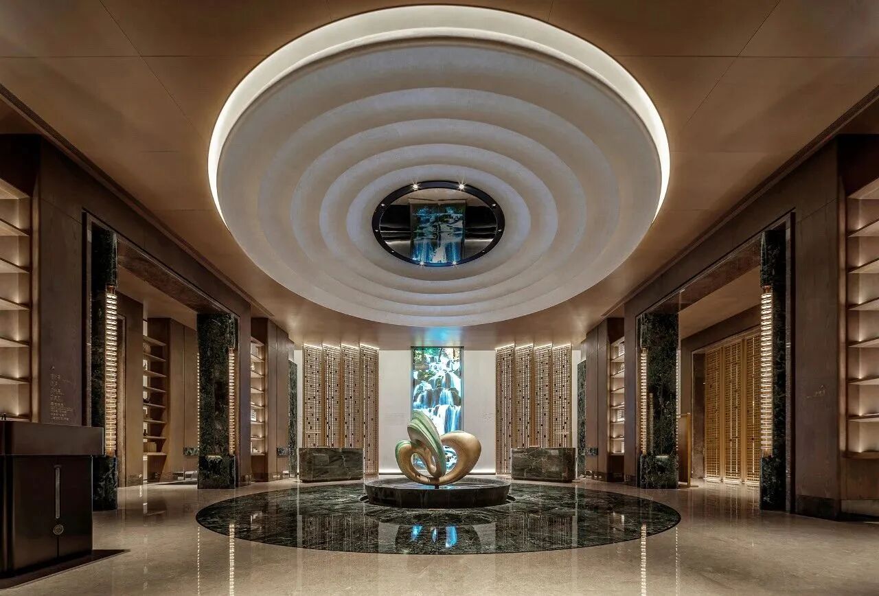 位于中心区域的水波纹圆形吊顶向四周延伸,形成天圆地方的构图关系。这种设计既呼应了传统宇宙观,又展现出和谐的空间比例。