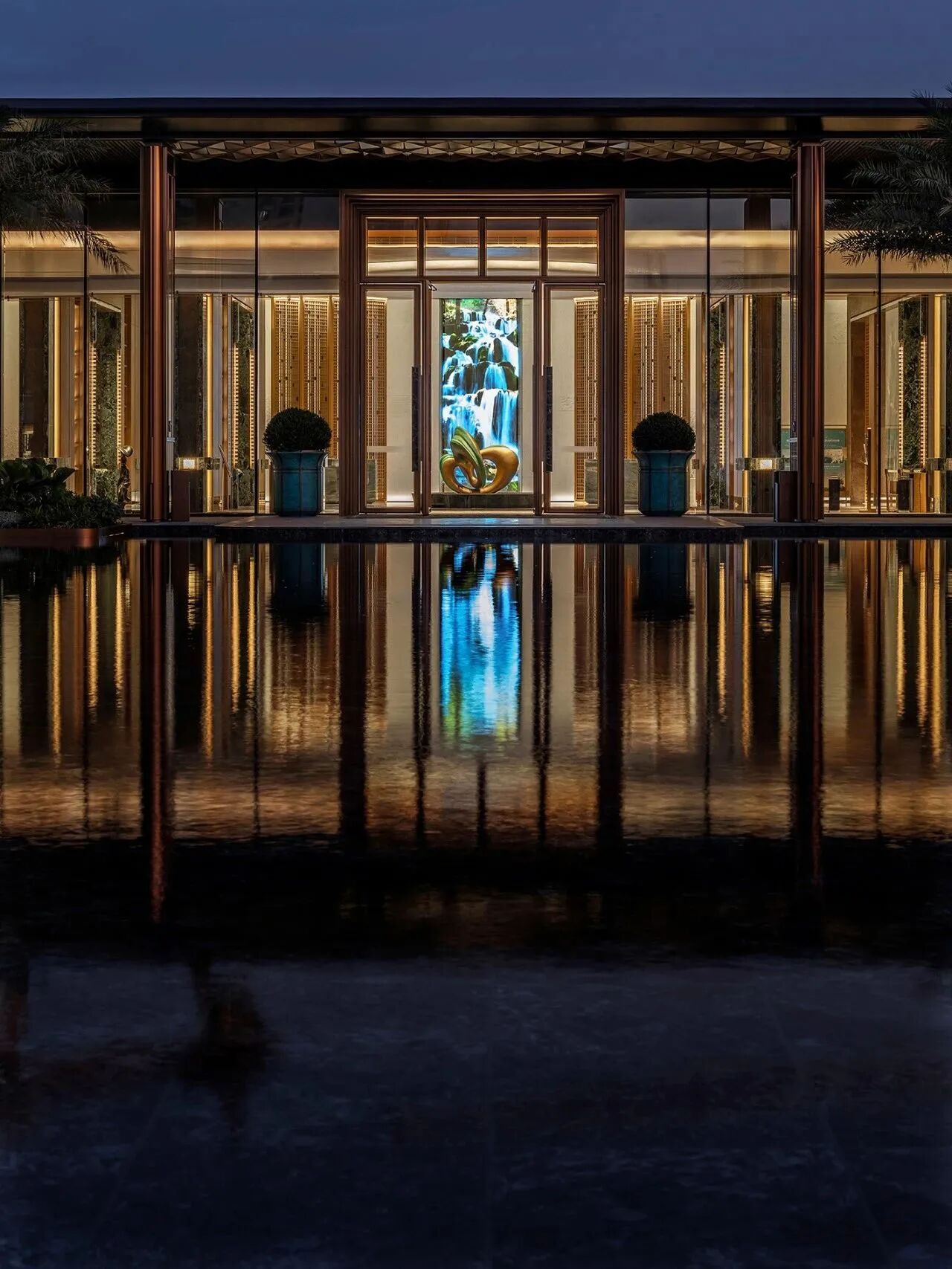 入口处的几何框架结构在水景映衬下棱角分明。清晰的线条秩序自然引导着行进动线,邀请人们深入探索内部空间。