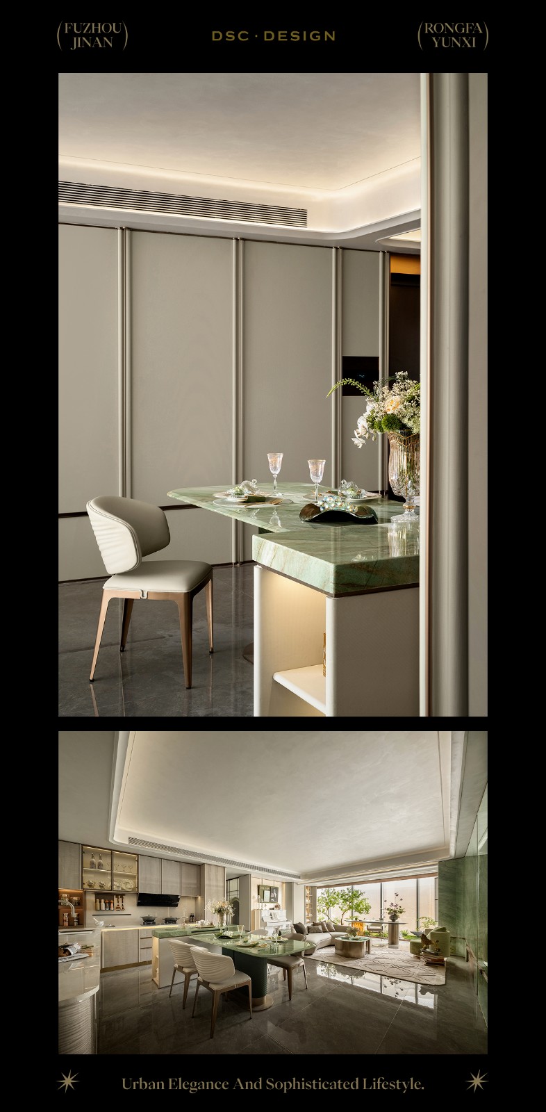作为三代同堂的理想居所,空间以海派风格为基底,将东方秩序美学与现代生活质感自然相融。温润石材、金属线条与柔和曲面交织碰撞,构筑出沉稳细腻的空间格调,氤氲出克制而不失温度的氛围。
