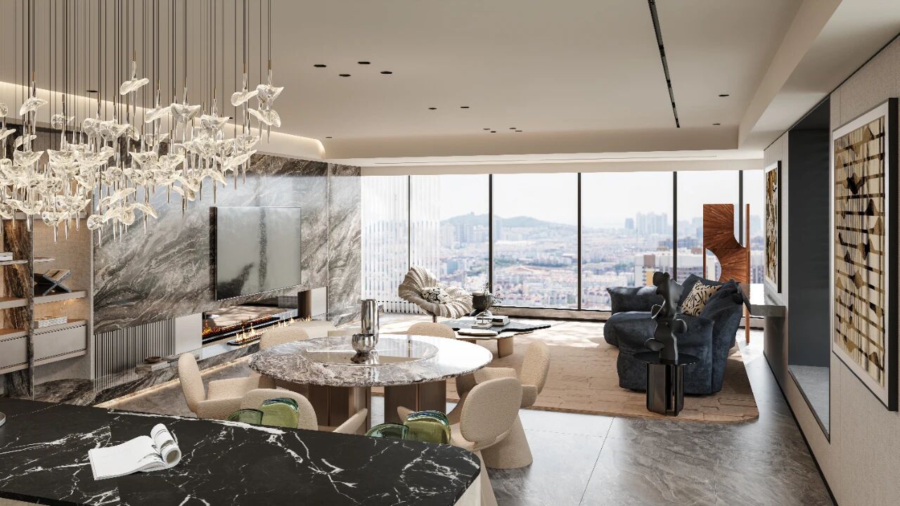 he dining area serves as a space where function and emotion seamlessly transition, without rigid boundaries, unfolding according to the rhythm of activity. The medieval yellow marble dining table features naturally rich but understated veining. Above it hangs a sparkling glass chandelier personally selected by the homeowner. Paired with a few wooden rattan chairs, the space forms a natural visual language. This area is not only for dining but also becomes a comforting setting for interacting with friends