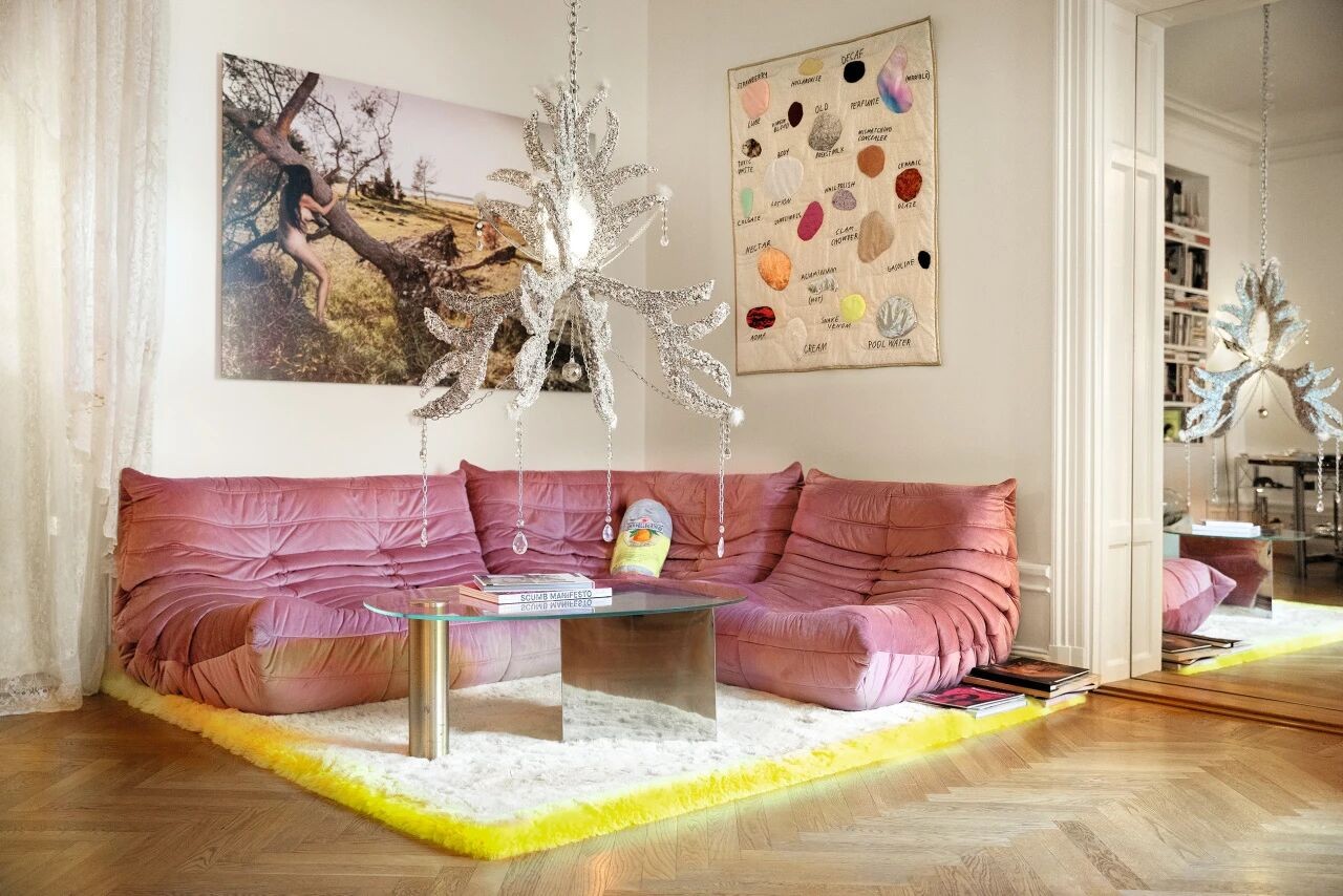 in the corner of the living room is designed by Italian artist Gae Aulenti. This piece embodies both a sense of its era and avant-garde qualities. It was the very first piece of furniture in the home, and now the homeowner has placed it in the brightest corner, highlighting the distinctive richness of this area.