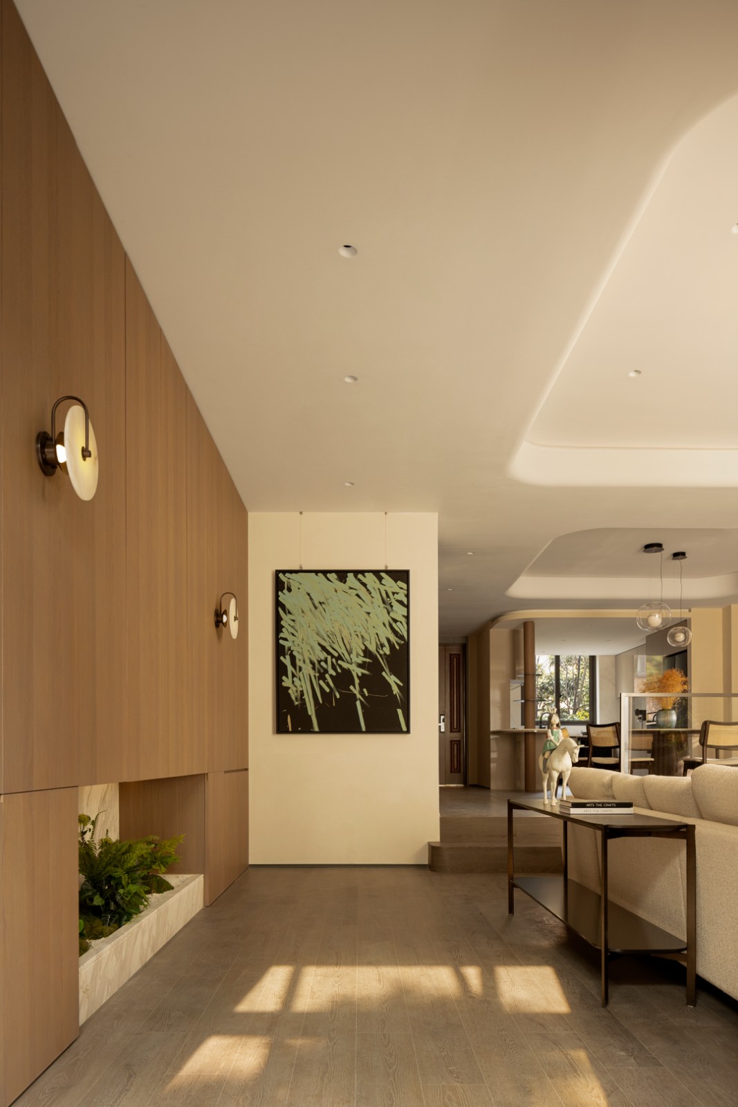 线与面的秩序构造,让场域间的仪式感不断贯穿其中。同时,空间的每个细节皆有所考究,兼具着时尚奢华的格调。光与影投射而下,让每个构件都充盈着自然光泽。