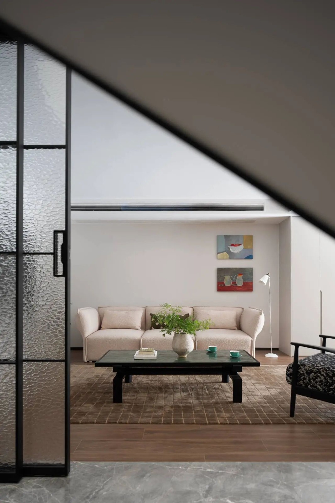 整个这一块对称,其实显得稍微有点突兀了,因为本身你营造了几个比较大的斜面,对称了就显弱了。我倒觉得是一个弧可能会更好,干脆选择一个更冲突的存在。毕竟入口特漂亮的这根弧形的扶手,是很灵动的,两个对称的的结果是,这一块气息好像突然止住了。