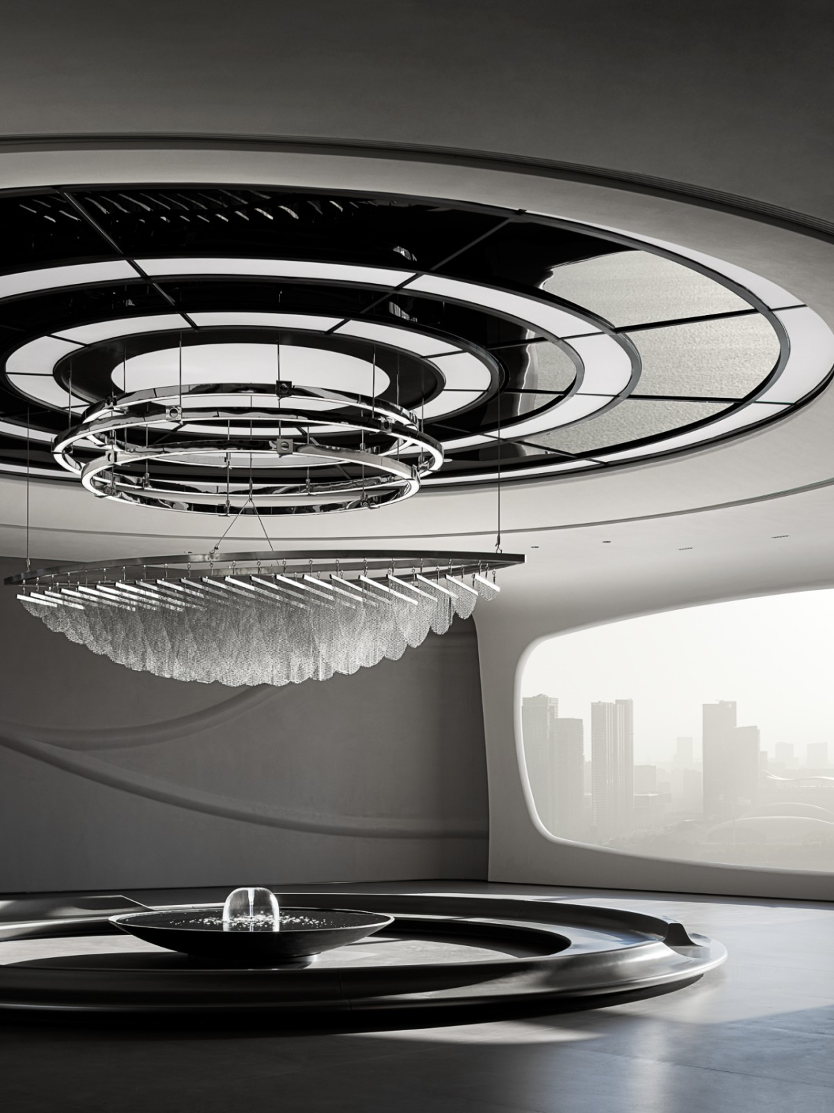 步出门厅,长廊忽启:哥特拱券的升腾节律被冷冽线性灯切割,玛瑙原石粗粝纹理与复古木柜的纤巧雕花低声交谈,镜面再将此幕层层递映,空间被无限折返。