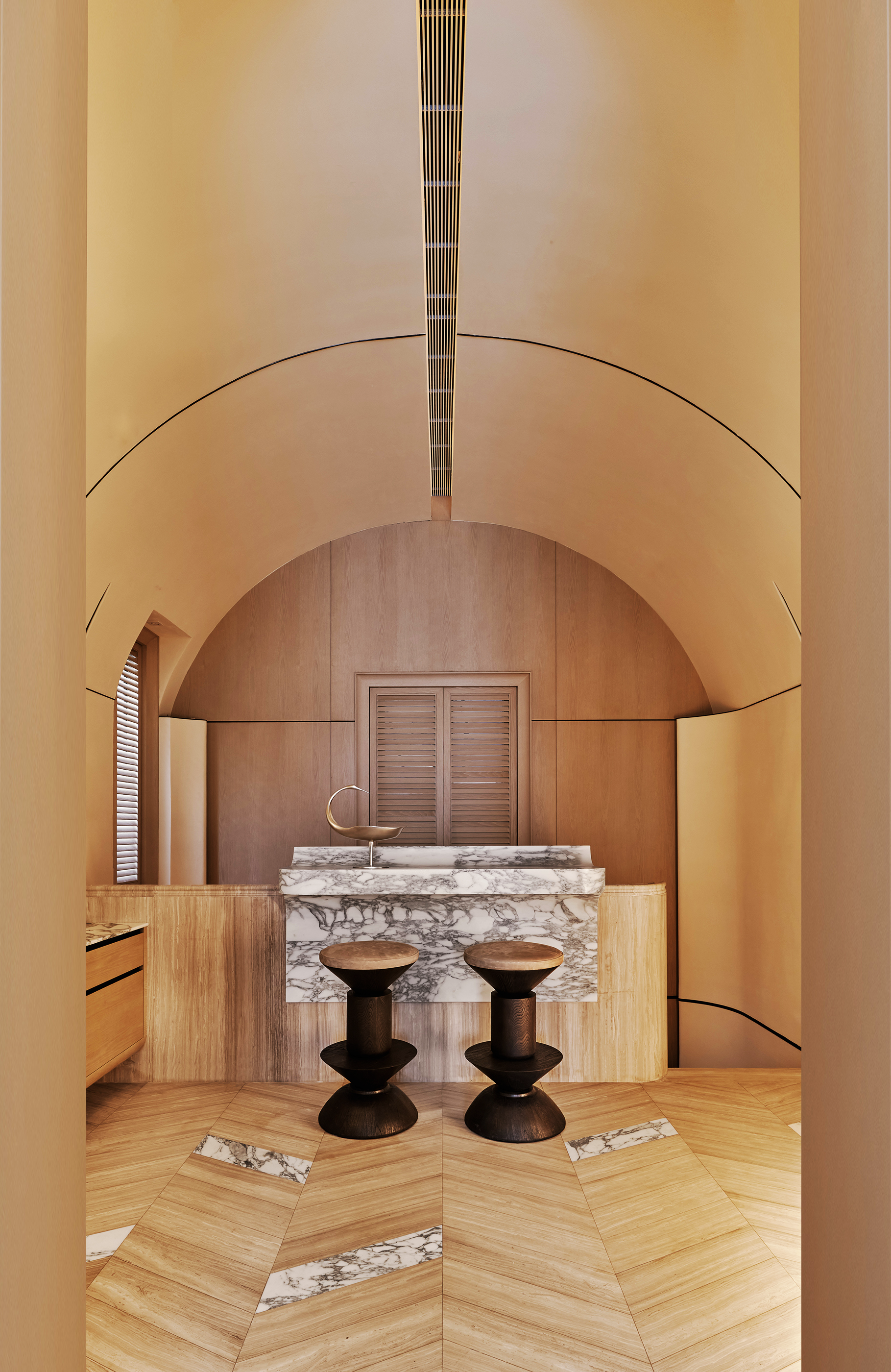 顺着弧形木质楼梯抵达地下空间,仿佛游走在一曲流动的乐章中。一切都共同呼应着水的特质,传递着低调隐逸情怀与圆融个性。