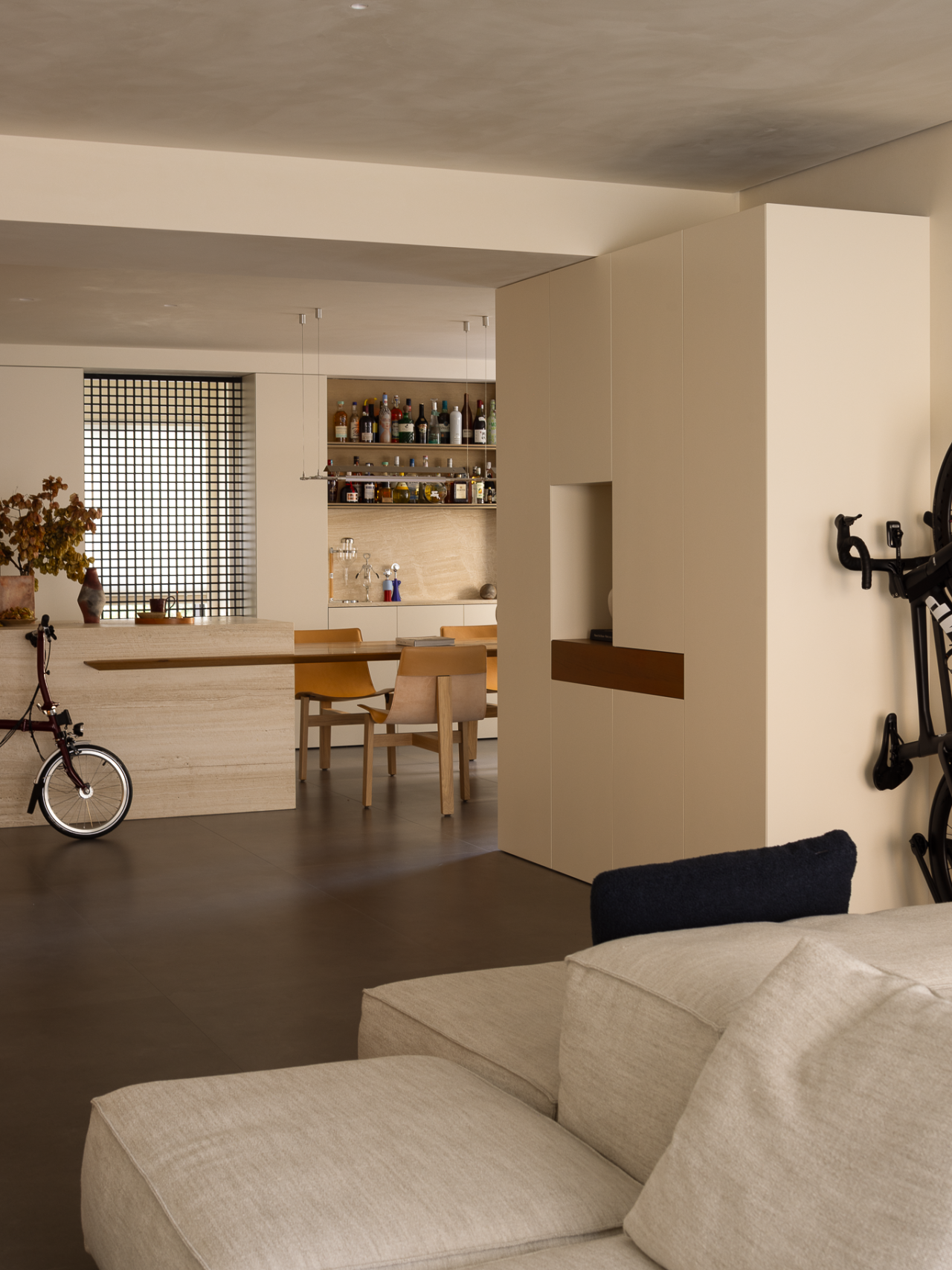 雷蒙与罗西刻意避开海滨建筑常见的海岸风装饰,转而从20世纪40至50年代的经典游艇内饰中汲取灵感:缎面不锈钢踢脚线、利落的镀铬饰面,再搭配高光浅色桃花心木定制的全套木作,共同勾勒出独特的空间秩序,既有航海工程的严谨规整,又不失居住空间的诗意温情。二人对漆面材料的偏爱,源于早年在法布里齐奥·卡西拉吉(Fabrizio Casiraghi)工作室的从业经历,在他们眼中,漆面不仅能折射光线,更会随时光流转、光影更迭,为空间赋予各异的鲜活氛围表达。