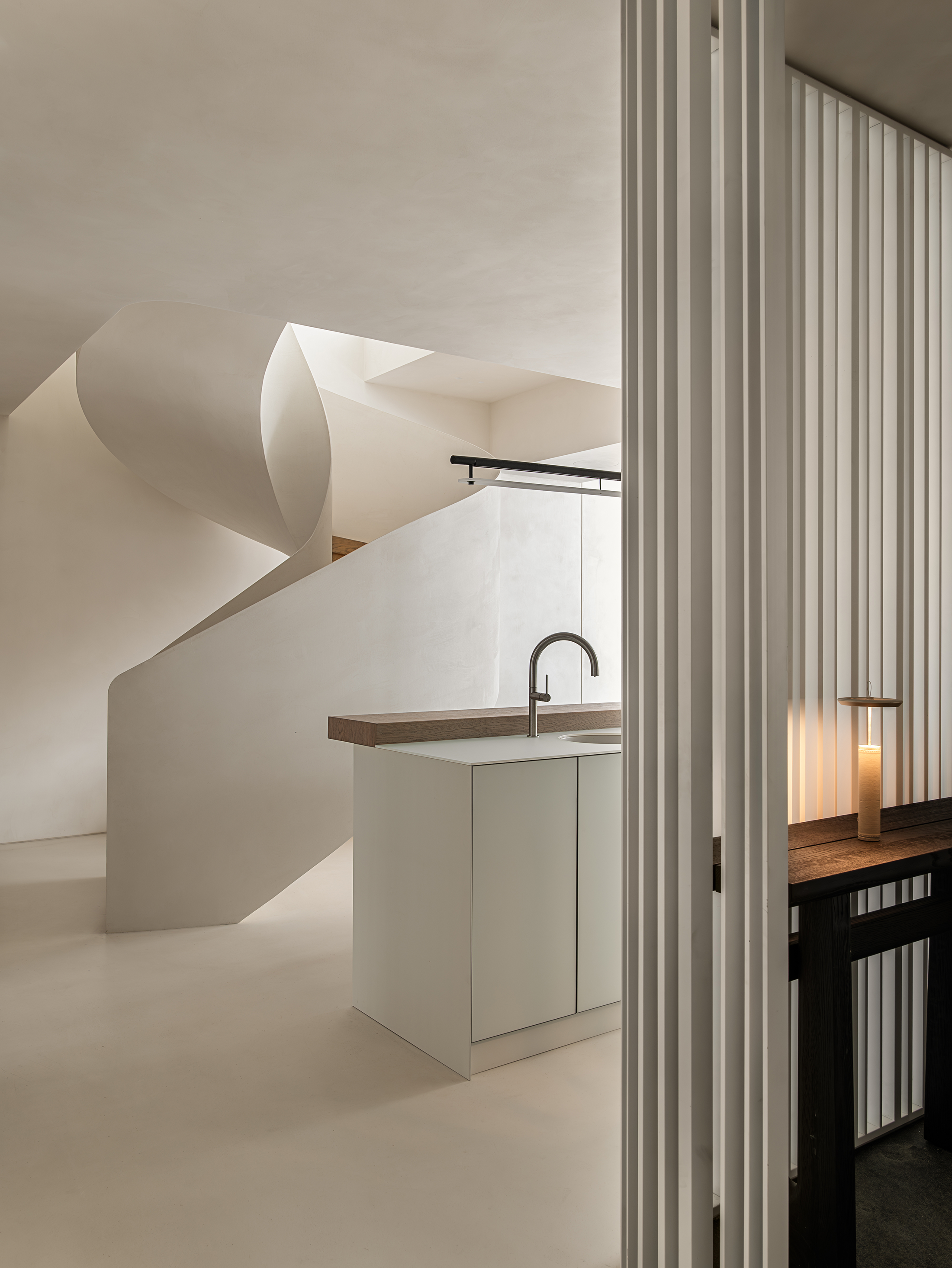 The furniture here is mostly custom-made, with the wood dyed a warm honey color throughout. It exudes a modern feel reminiscent of the 1980s, while also evoking the smooth and fine hull of a Riva yacht. Ingenious details such as hidden seats and drawer-like cabinet doors draw inspiration from the interior design of yachts from the 1930s. Within the orderly and rational order, a touch of surprising elegance is subtly hidden. To fully highlight the texture and presence of the custom furniture, the other furnishings in the space are deliberately made to have a reduced presence, not competing with it. The kitchen on the ground floor of the building is connected to the living room, and artist Antonin Lamoot paints a myriad of Breton skies on the low ceiling. Looking up, it feels as if one is standing on the deck of a yacht, with the sea breeze and sunlight seeming within reach. The upper floor of the building is a simple and neat guest room area, while the top floor is Solange Raymonds private residence. The overall design strikes a perfect balance between restraint and simplicity and a warm texture, outlining a contemporary elegance that is unadorned and freely flowing.