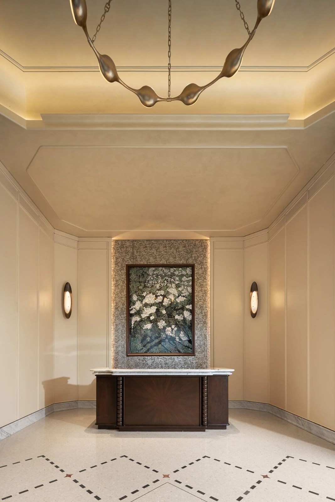 幕启为意象,电梯厅与前厅构成进入世界客厅的第一重体验。以极简的形体与克制的材质,呈现出从城市喧嚣到艺术静谧的过渡氛围。墙面选用温润的石材基底,搭配精致的金属细节,在灯光的映衬下呈现出微妙的光影变化。