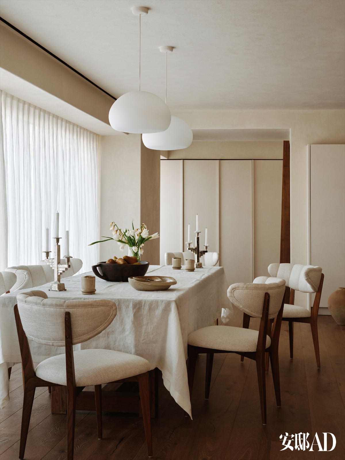 餐区中的白色复古轮廓餐椅来自Linoti品牌,Linoti成立于2011年,致力于打造精美现代手工制作家具和室内元素,白色餐椅用优质实木打造,与空间肌理呼应,将复古韵律揉入现代休闲感,让家具成为兼具个性与长效美感的空间主角。