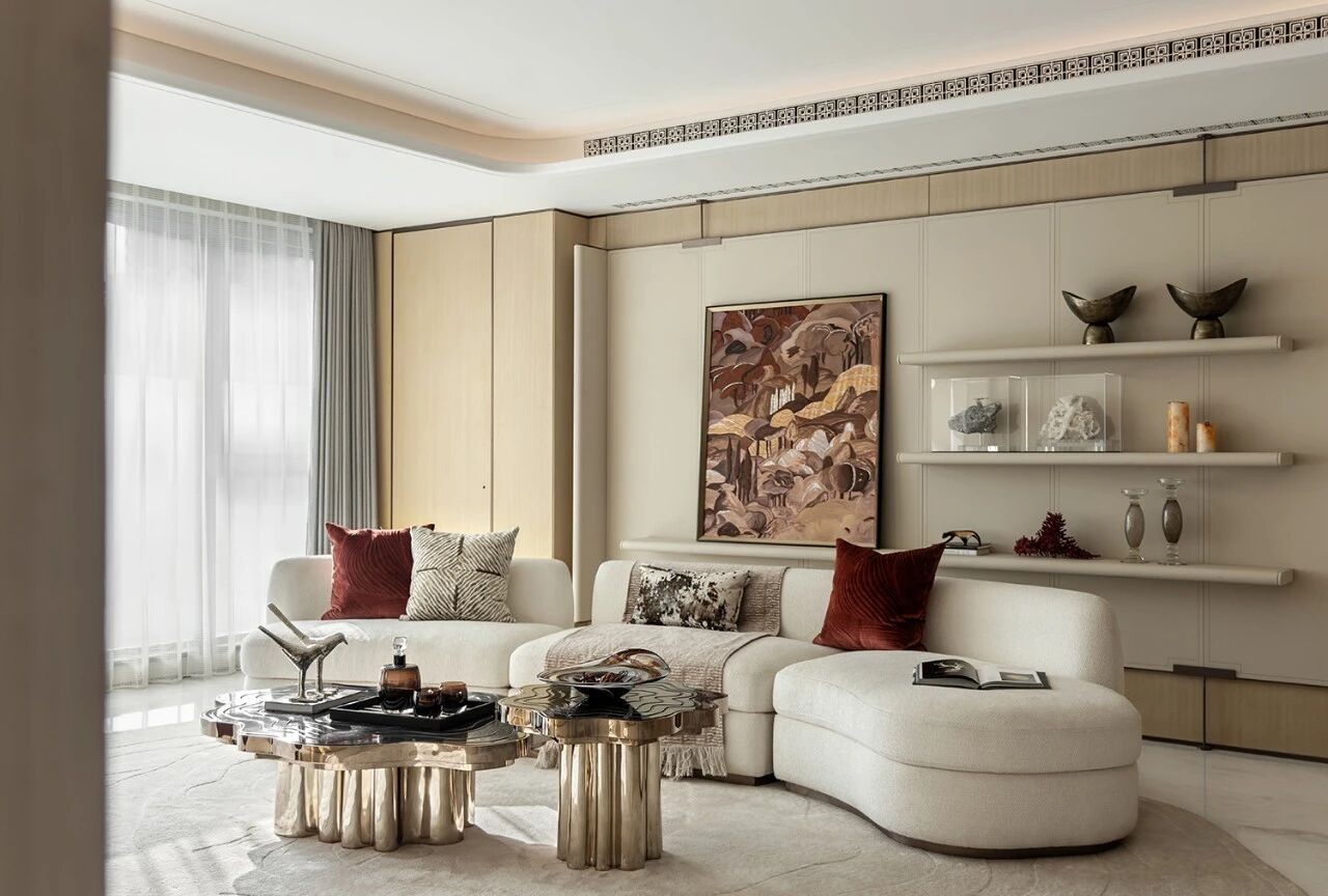 项目主材: 白玉兰大理石、橄榄绿大理石、仿铜不锈钢、陶瓷、柔性岩板、艺术玻璃等