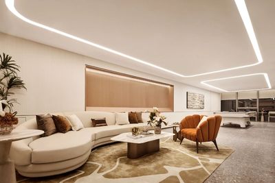 中性色調鋪就靜謐基底,森系綠與橙咖色點綴其間,高級面料、皮革與大理石交織,勾勒空間質感層次。曲水潺潺雕塑與燈具取意淮河流水,玻璃鋼肌理映著光影流轉,圓形環抱設計擁抱每一份鬆弛。