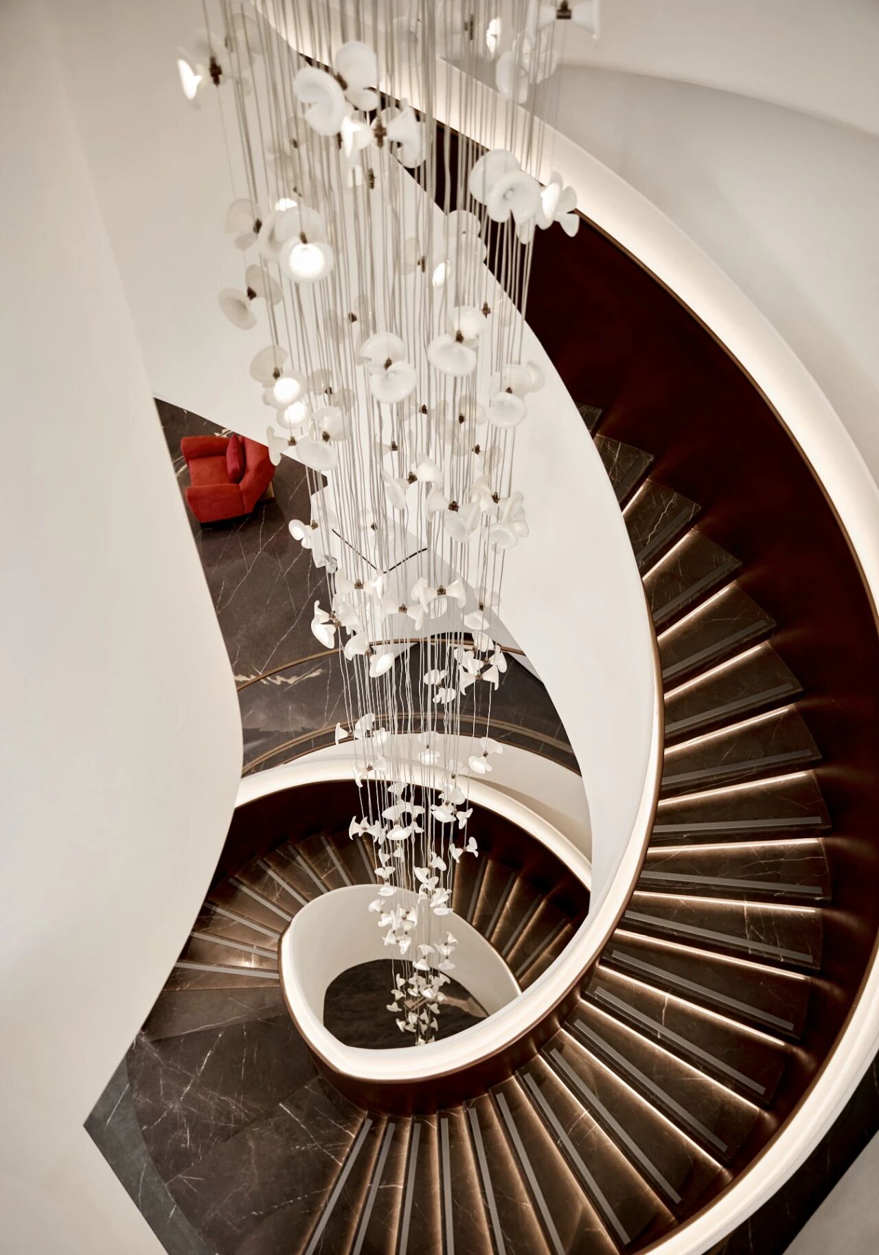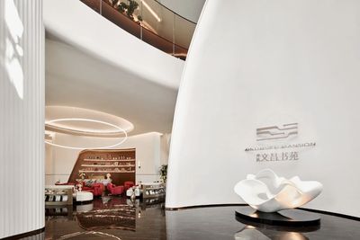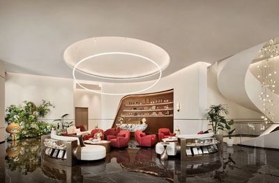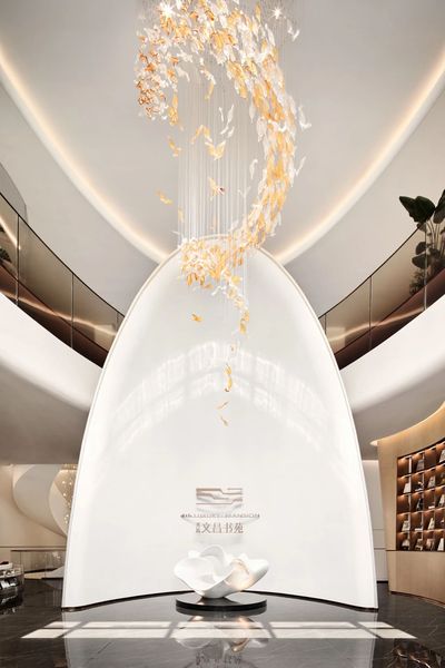 Neutral tones lay a serene base, accented by forest green and orange-brown. Premium fabrics, leather and marble interweave to shape a textured space. The flowing water sculpture and lamps, inspired by the Huaihe River, reflect light on their FRP texture, while the circular embracing design holds every moment of relaxation.
