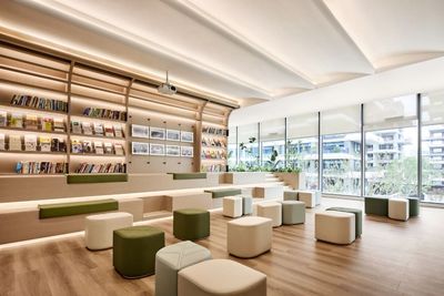 Smart design lies in details: hidden sockets and USB ports on furniture meet modern readers electronic needs, freeing them from worrying about battery life. At the spaces visual center, greenery peeks through bookshelves, coexisting with the full-height reading table. The blend of book scent and plant fragrance creates a reading area where people, books and nature harmonize.