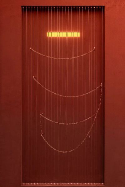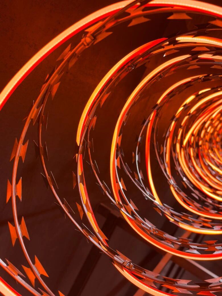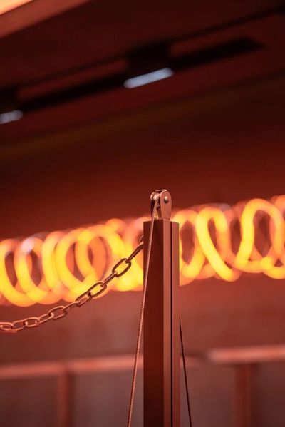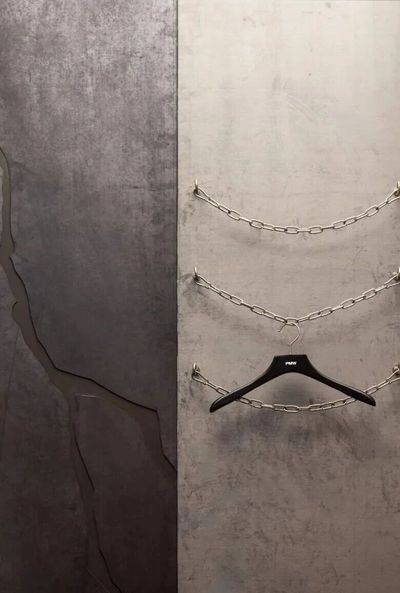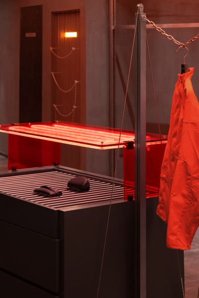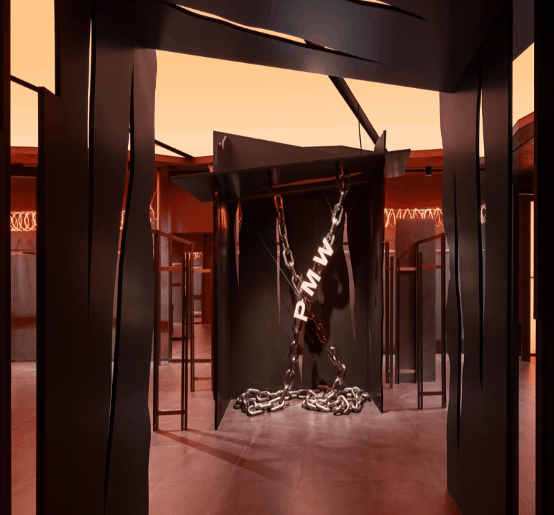 而发光的带电金属网,粗大的铁链,刺激观感的同时,将消费者与场景联系,化身被监狱牢牢困住的主体,引发主体对现实生活状态的紧张和不安。