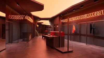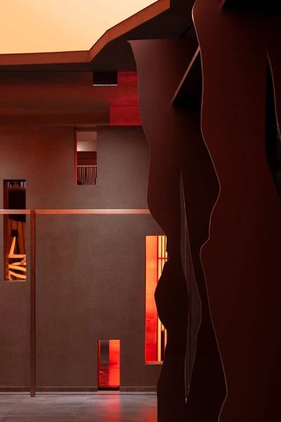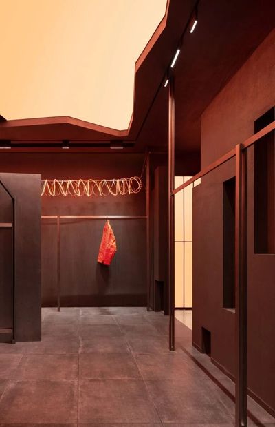 店铺空间整体处于暗红色的状态,如同地下熔岩,不规则的天花板,开裂的电镀地砖,营造破碎的空间体验,紧张而不失力量。进而在细节上升华了