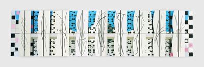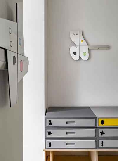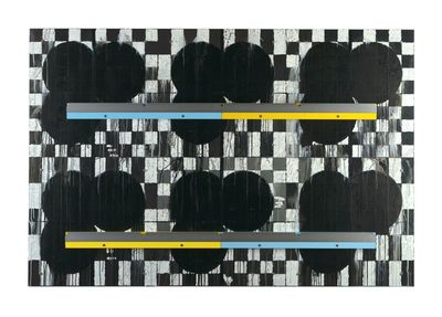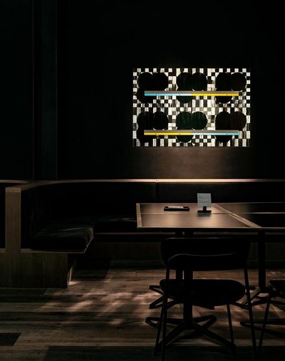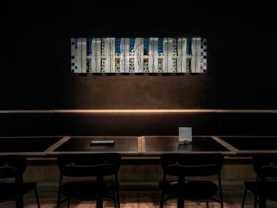 与咖啡空间相连的长走廊通向一间黑色充斥的餐厅空间,宛如系统后台运作时的“暗箱”。其中一件长 1.5 米的作品 (2025) 中,镶嵌着 9 件看似形状完全相同、朝着同一方向的“信物”。与咖啡厅中的“信物”不同,它们画面中的彩色元素似乎转移到了背后的板面之上,只留下如“骨架”般的黑色线条;与之相邻的作品《关于缺失的叙事》 (2025) 则完全相反,仅有两条“空位”出现在画面中,画面中 6 个相似的图形仿佛暗示着理想“信物”的形态——它们会在不久后被“捕获”,使其完整。