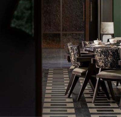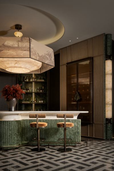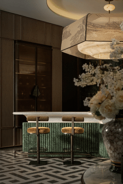 水吧区居中而设,环形吧台聚拢非正式社交的能量场。吊顶上空设计聚焦于一组定制吊灯,在光影中重现河流舟楫的轮廓剪影。与下方吧台石材的天然肌理形成跨越千年的对话呼应,虚实相生。
