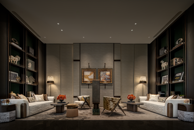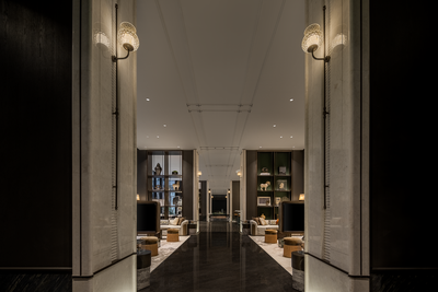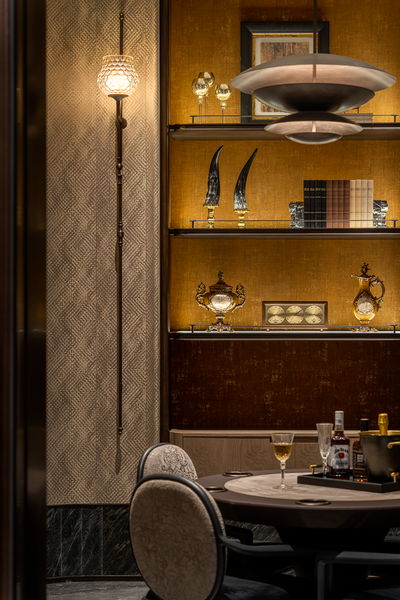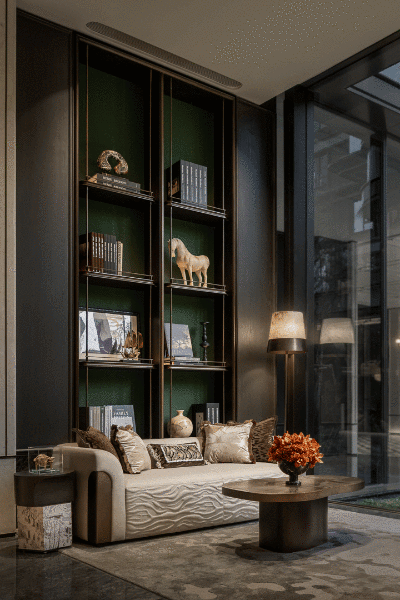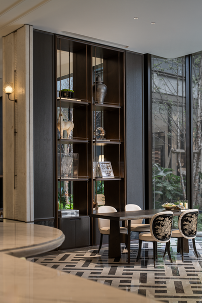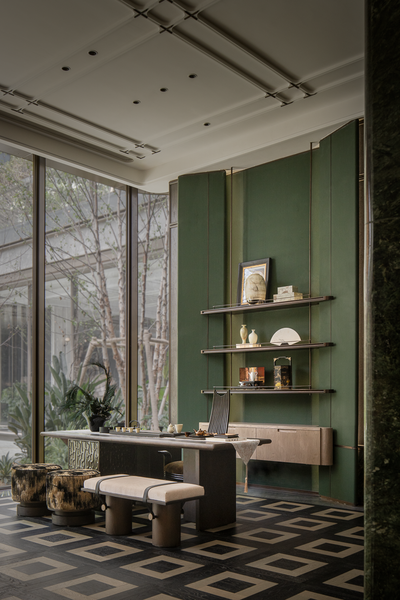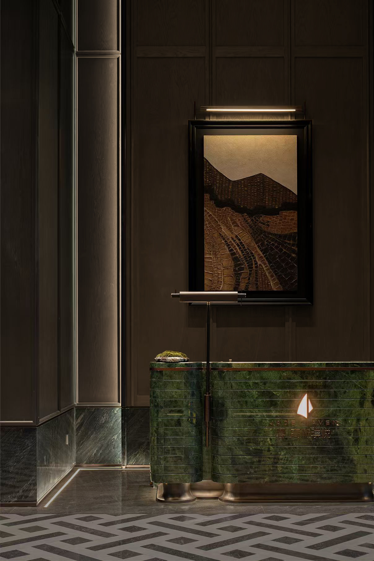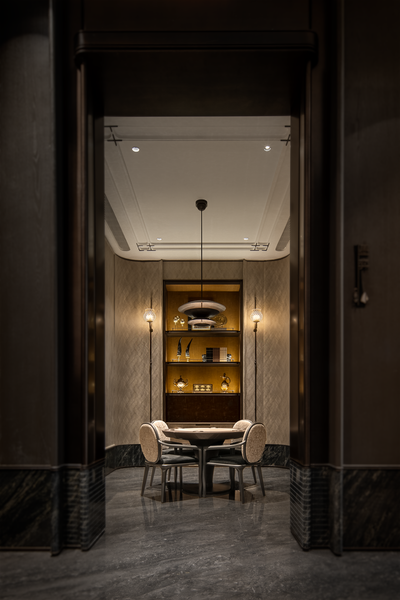 穿过走廊,空间节奏由收至放,访客视线与心境随之舒展,抵达洽谈区。动线暗合唐代园林“移步换景”的造境手法,配合线性灯光引导,行进间完成由公共领域向专属社交场域的自然转换。