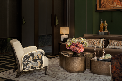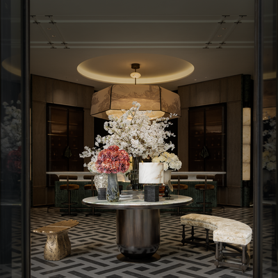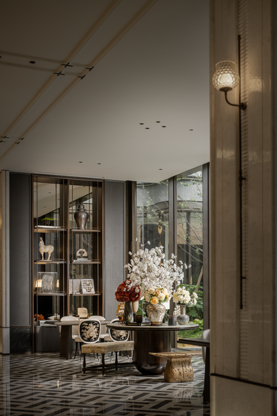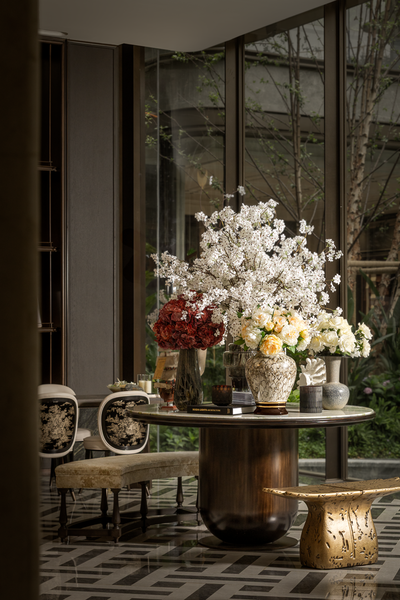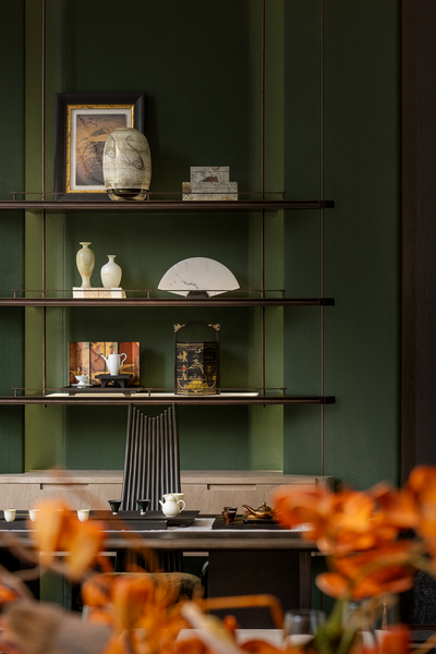 洽谈区一侧的圆桌之上,花艺以盛唐气象为灵感,繁复拥簇,浓墨重彩,再现唐代华贵雍容之美。其后置物架陈列多种唐代纹样器玩与艺术品,形成浓郁的文化景深。