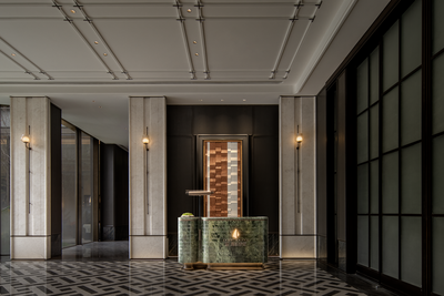 高定木饰面以细腻的拼缝工艺,从容展露天然肌理,与哑光金属构件、温润石材低调共生,勾勒出深邃而含蓄的光泽层次。