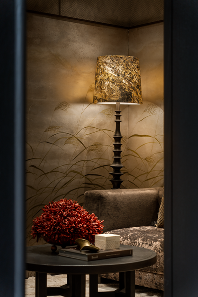 作为空间序列中的精神归隐处,VIP洽谈区以极简的设计语言构建了一处静谧的身心栖息地。屏风采用天然芦苇手绘壁纸,其细腻的纵向肌理在氤氲的暖光映照下,形成柔和而富有生命力的背景,隐喻自然与人的深层连接。
