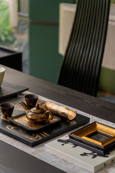 茶具托盘饰以流水纹理,呼应空间整体的度假意趣。一壶沸水,两盏清茶,在光与影、虚与实的交替中,寻得片刻。