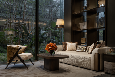为理念,采用半围合式布局,巧妙平衡开放与私密。沙发与弧形单椅自成单元,流畅的曲面靠背自然勾勒出谈话的场域