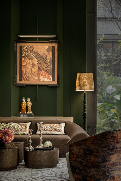两侧对称布局的青铜壁灯以现代极简线条重新诠释唐式灯具,成就一场跨越千年的雅趣之宴。
