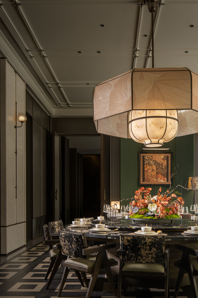 圆形宴桌静置于空间中央,其流畅的轮廓消弭了主客之分。顶部吊灯从西安古银杏中汲取灵感,以简练的造型语言重新诠释自然形态。其柔和的透光特性将暖光过滤为温润的光晕。