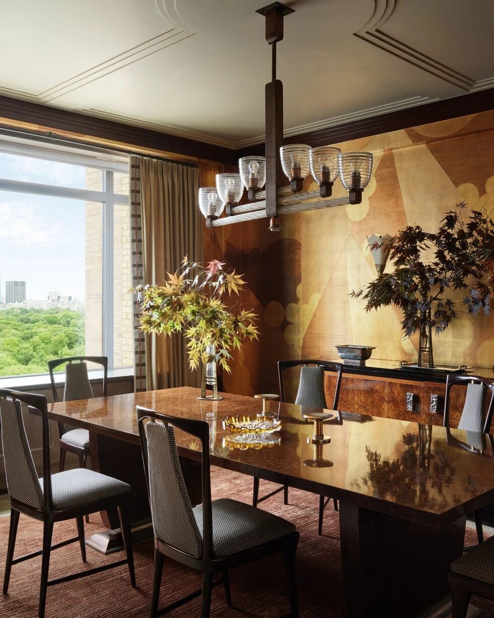 餐厅无疑是高潮。定制的 de Gournay 金箔壁纸,交织漩涡与锐角线条,源自帝国日本的艺术语汇,又融入Jean Dunand的装饰语言。灯具来自上世纪三十年代的意大利,餐桌与椅子在法式与中世纪现代之间游走。空间在复古与摩登的张力下,仿佛镀上了一层黄金的薄雾。