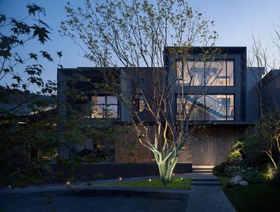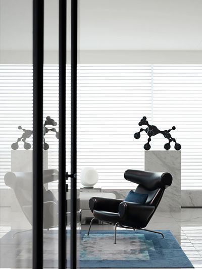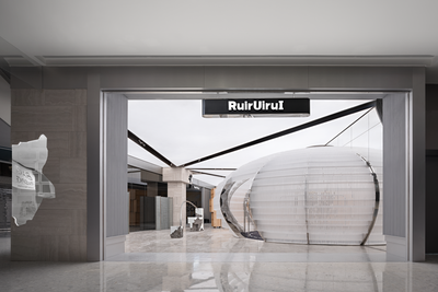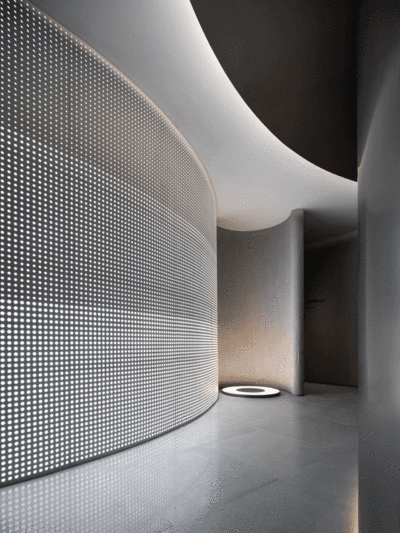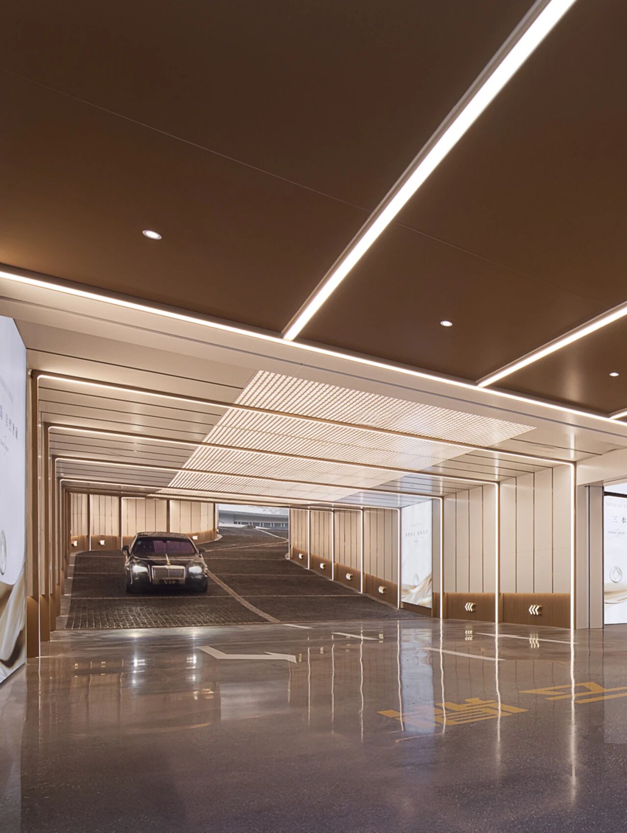 设计师以 “冰裂纹”为灵感,采用马蹄石通铺双坡道,其天然石材的肌理与防滑性能,既巧妙应对了绍兴的梅雨季节,又充分考虑了未来车辆的行驶体验。顶部铝板雕琢的迎宾动线,以金属的冷峻质感对抗潮湿侵蚀,在时光中沉淀出历久弥新的高级感。坡道两侧隐藏式线性灯带,消解地下空间的压抑感;车灯划过石材表面时,光影与肌理交织,归家之路如行于璀璨星河。