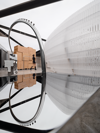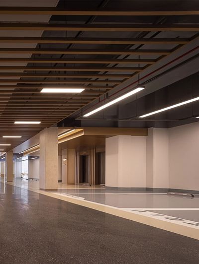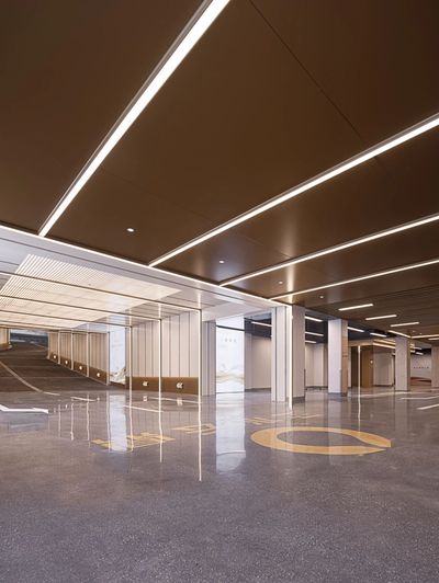 车库顶部以“星轨”为灵感,采用铝板与光纤灯结合,通过精密计算的光折射角度,营造出“星垂平野阔”的视觉震撼。当车灯划过穹顶,光影在金属表面跳跃,让每一次车行都成为穿越宇宙的时空之旅。