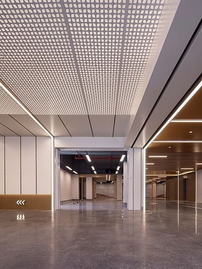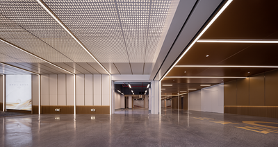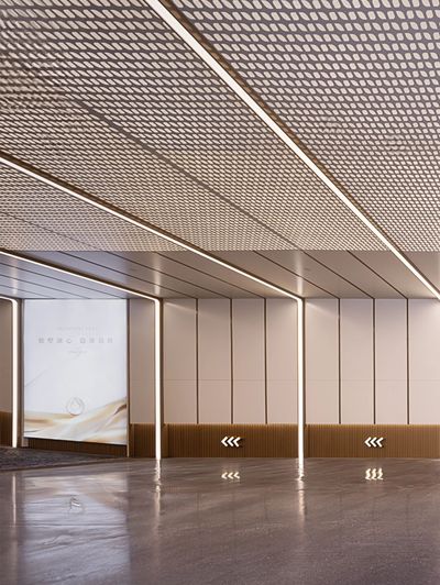 传统地库的管线裸露问题,在三水云鼎被转化为设计语言。设计师以“解构-重组”的手法,将消防、通风、照明管线纳入铝吊顶体系,通过模块化组合与灯光层次设计,让管线成为空间秩序的“隐性表达”。
