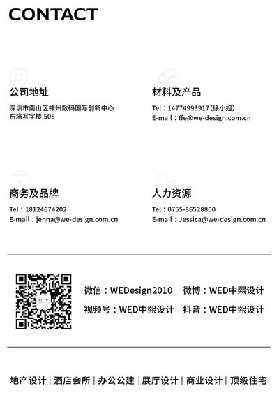 WE,寓意“东与西”,也代表着“我们”,展示了青年一代设计人的抱负与态度。团队由郑熙先生带领,自2010年于深圳成立以来,以艺术为内因,WED中熙设计不设界限,服务领域包括旧建筑改造、地产设计、酒店会所、办公公建、展厅设计、商业时尚及顶级住宅等。以“WE Design Future (着眼未来的设计)”为创作精神,探索前卫、精彩的现代设计,希冀以此为出发点,为各个行业探索新的边界。历经十余年专业建构,中熙设计展示出掌控不同规模和尺度项目的能力,更成为当代生活方式的探索者与引领者。