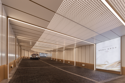 铝板雕琢的迎宾动线,将品牌符号解构为几何光影矩阵,与顶部星轨形成空间对话,让归家者还未踏入家门,便已沉浸于定制化的尊崇感。车道两侧的导视系统,通过精确控制字体间距,确保在行驶中能清晰辨识,这背后是设计师对“人车行为学”的深度洞察。