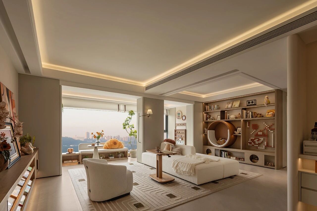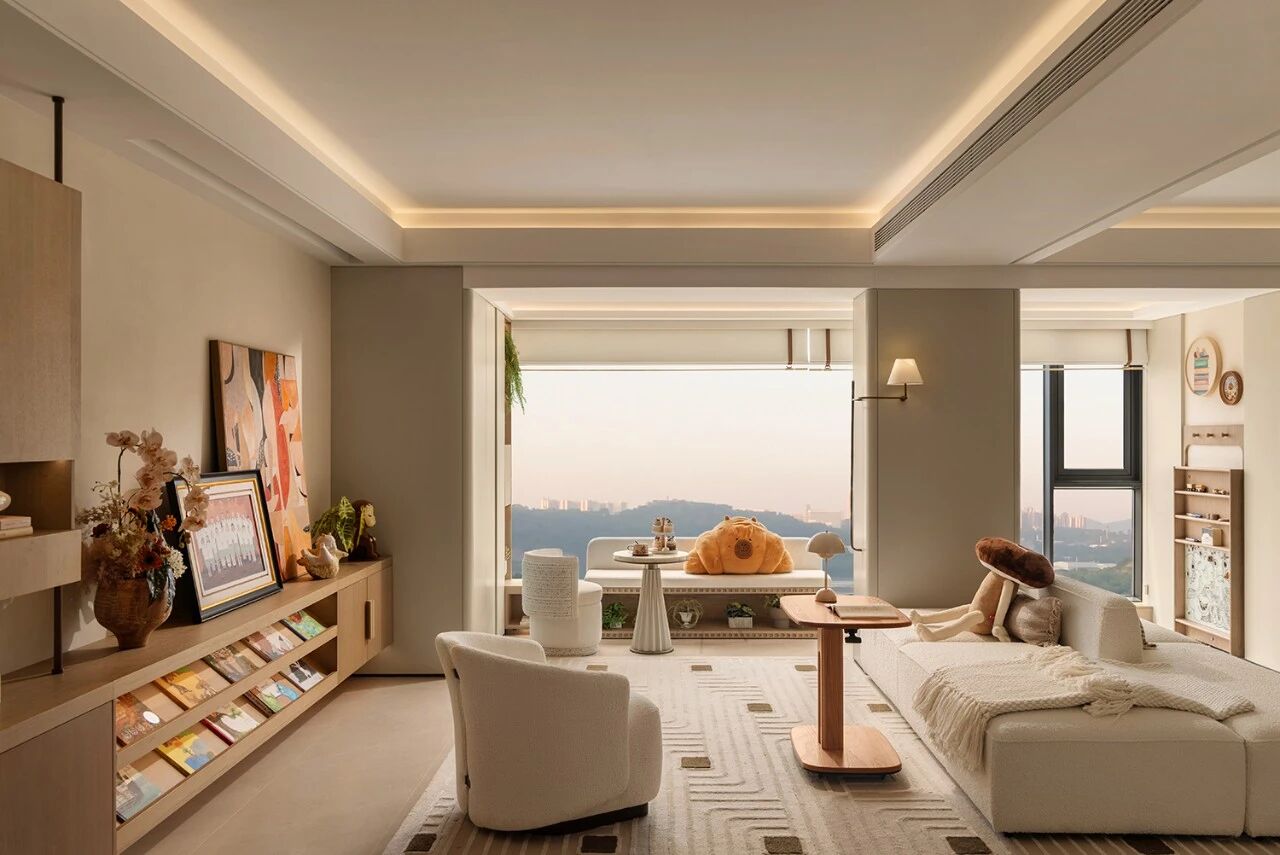 开放式客厅以柔和的米白色与温润的木色为底色,轻轻晕染出轻盈又满含温情的空间氛围。