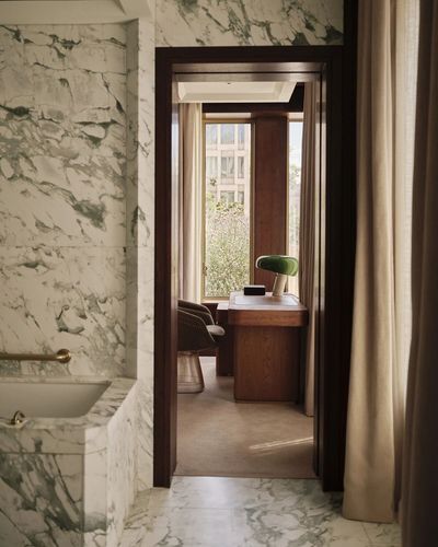 小型套房的浴室全部铺满了绿色印度大理石。Joseph Dirand说: