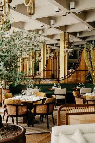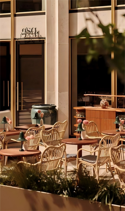 是酒店与街区生活的柔性节点。柔米色座椅、绿色沙发与植栽交织出轻盈质地,室内与露台之间无缝衔接,让人仿佛依偎于广场一隅。